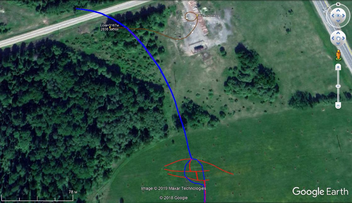 На рис.1 приведена проекция траектории ствола скважины №11 (кривая линия коричневого цвета), узел тектонических нарушений (линии красного цвета) и ближайшее к ней небольшое УВ месторождение, контур которого в 200-х метрах к югу от скважины отмечен линией синего цвета. Несколько осложняет его структуру насыщенный нефтью разлом, раскрытие которого серией сдвигов вдоль пересекающих трещин, образовавших каналы внедрения глубинных углеводородных флюидов, и сформировало здесь это месторождение.
