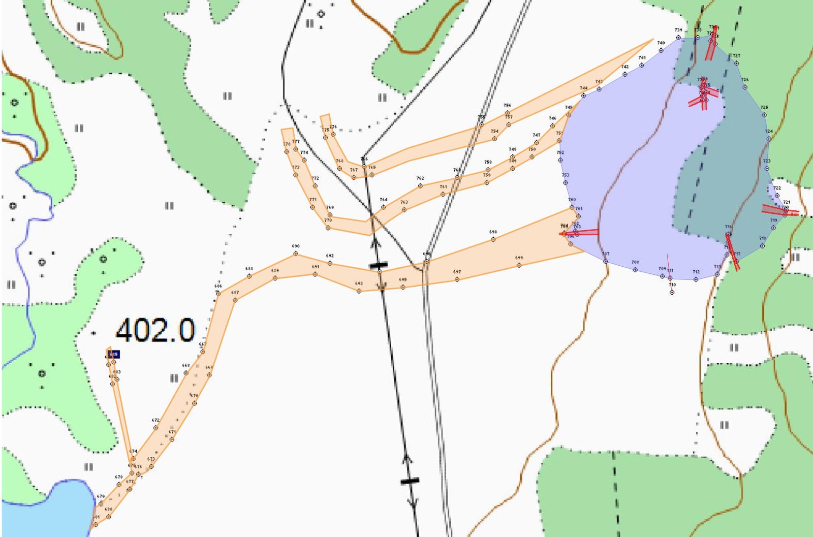 На маршруте по полевым дорогам от с.Джеланды до технологической установки с действующей газодобывающей скважиной на Чкаловском месторождении никаких крупных аномальных зон обнаружено не было. Граница первой аномальной зоны здесь была пересечена лишь в нескольких метрах от огороженной производственной территории. Исследование этой аномалии, форма и структура которой схематически отображены ниже (рис.1), при пешем её обходе показало, что она имеет весьма ограниченные размеры (контуры залежи УВ выделены синим цветом, разлом — красным, границы огороженной технологической установки указаны желтыми линиями, зелённым — точки профиля РАП).