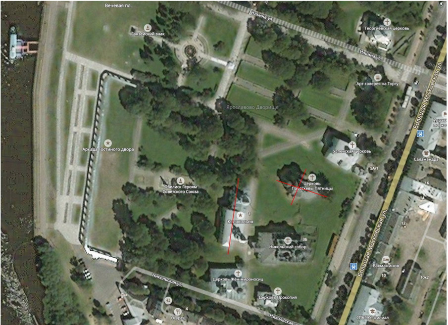 Рис.4 Ярославово Дворище.Во время одной из прогулок по городу был обнаружен такой же крест аномалий и под Пантелеймоновской церковью по улице Тихвинская, что может указывать на её древность. А вот при заложении нового Православного храма (рис.5) в одном из современных микрорайонов города, проверить который на данный предмет пригласил меня представитель Застройщика, эту древнюю традицию уже не предусмотрели. Следовательно, в местной епархии о ней и не знают. По её рекомендации своим алтарём этот храм был ориентирован на современный Иерусалим. Видимо, там ещё уверены в том, что он настоящий! Но всё же крест из очень мелких линейных аномалий случайно под этим храмом оказался, но совсем не по его центру и ориентирован он не по осям здания.