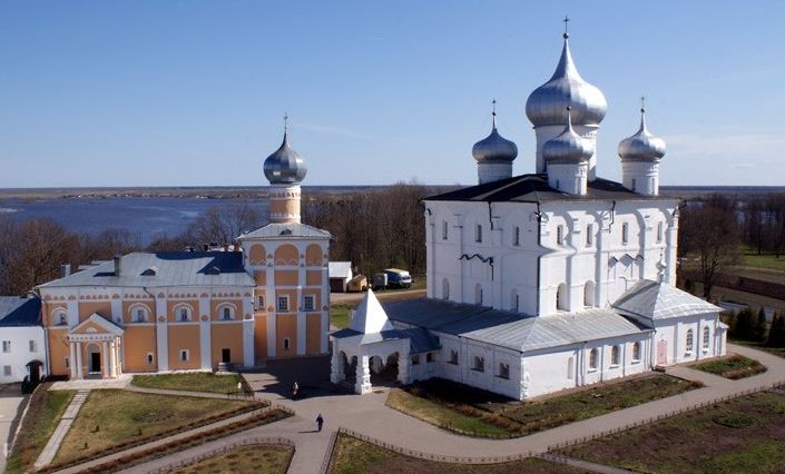 Рис.1 Спасо-Преображенский Варлаамо-Хутынский монастырь в Великом Новгороде.В качестве наиболее наглядного и доказательного примера этого можно привести результаты последнего исследования на данный предмет, проведённого мной на территории Спасо-Преображенского Варлаамо-Хутынского монастыря в Великом Новгороде (рис.1). Оно чётко указывает на причину весьма необычного взаимного размещения двух центральных храмов (рис.2). Именно так здесь расположены кресты, сформированные двумя узлами узких линейных аномальных зон. Такой же крест из линейных аномалий фиксируется точно под центром здания с куполом и аркой, являющимся входом в монастырь. Имеется он и под Варлаамовской часовней, расположенной чуть в стороне на насыпном бугорке. Правда, её современный новодел сориентировали неправильно — оси бревенчатой часовенки, поставленной здесь уже явно в наши дни, не совпадают с направлением простирания линейных аномалий. Это является очередным подтверждением (о других расскажу ниже) того, что местной (а скорее всего не только) епархией уже давно утеряны древние традиции, которыми руководствовались наши не такие уж и далёкие предки при строительстве подобных объектов. И этот факт в очередной раз указывает на то, что современная православная церковь имеет сомнительную связь с той, что была до её, так называемого, раскола. Похоже на то, что сегодня там совершенно не знают (или скрывают) кто и как строил все эти храмы.
